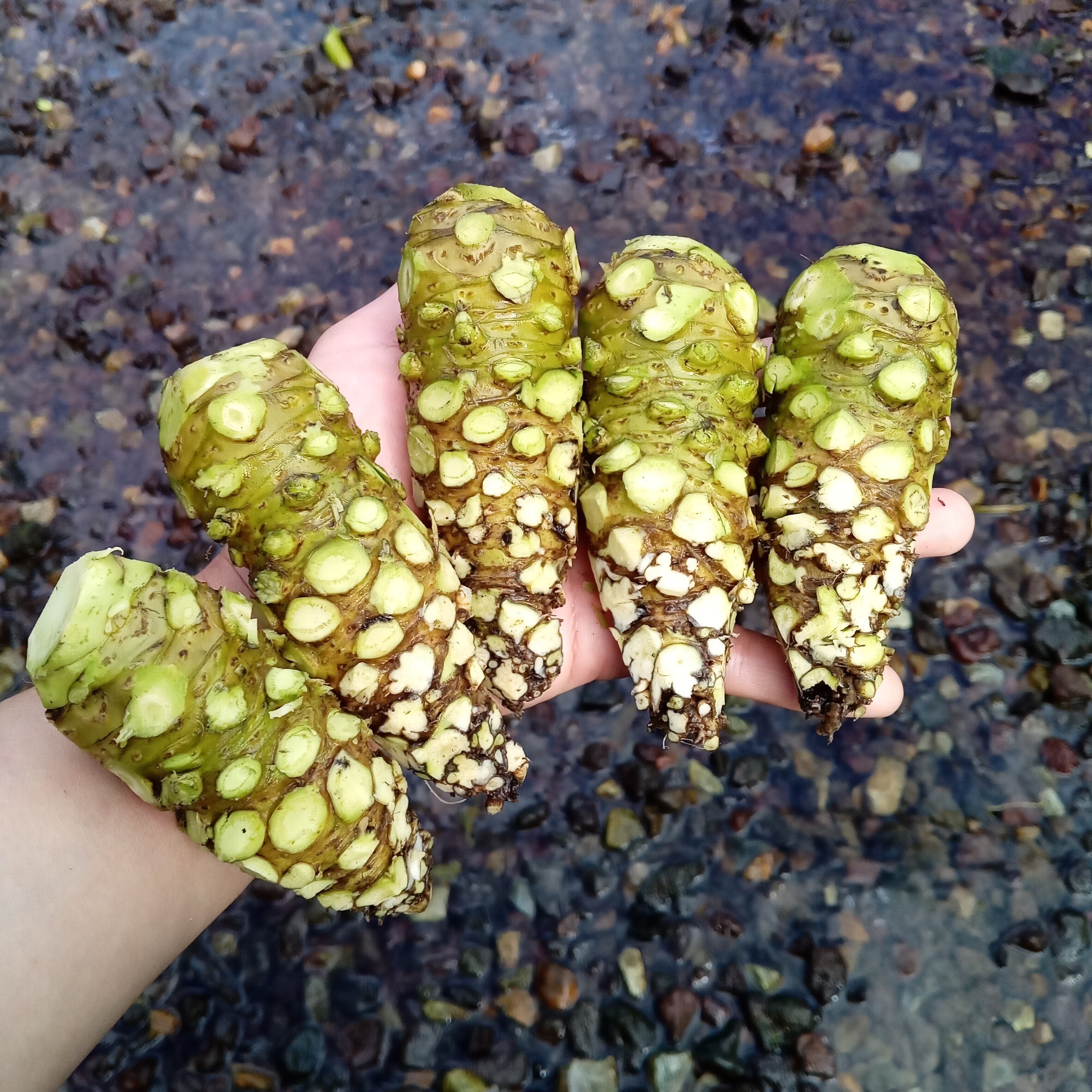 300 年続くわさび田を守り、湧き水と溶岩の石ころを利用して栽培しています。無農薬で栽培し、収穫までに約2年かかります。