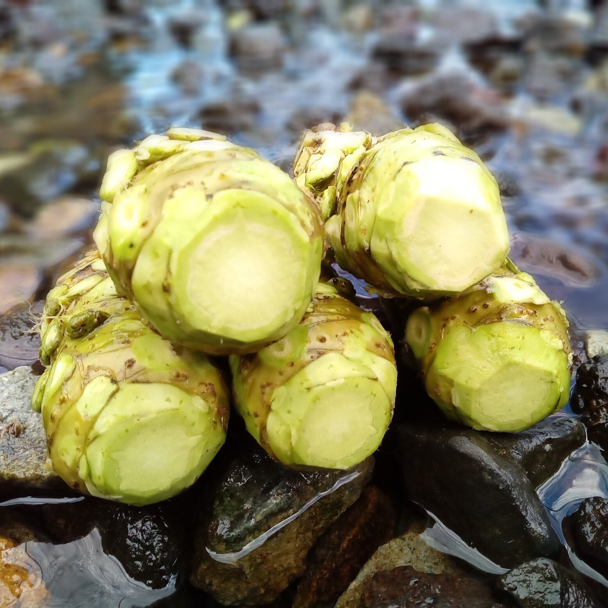 300 年続くわさび田を守り、湧き水と溶岩の石ころを利用して栽培しています。無農薬で栽培し、収穫までに約2年かかります。
